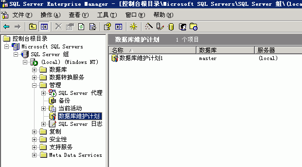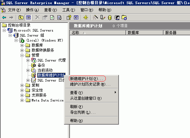然后打开SQL2000企业管理器,点击开始---程序---Microsoft SQL Server---企业管理器,并右键点击“数据库维护计划”,开始“新建维护计划”