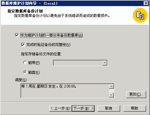 之后始终按照默认选项到“指定数据库备份计划”框,如果您需要对备份时间进行调整可以点击对话框中的“更改”来调整变更时间