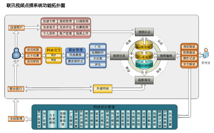 一、方案简介 联讯视频点播解决方案基于本公司oVideo视频播客系统、ovServer转码服务器组合。本解决方案基于Windows NT平台,采用Sql server数据库,是国内首款Windows平台下专业视频点播系统。本系统提供了从视频处理到视频分享的快速建站系统。本系统支持国内常见的几十种视频格式,不论是用DV,手机拍摄的,还是从网上下载的电影片段,MTV,都可以将视频媒体文件高效转换为flv格式,高速转换,显示清晰、流畅,用户可以快速有效的对视频文件进行发布和分享。 二、系统特点 1、采用全新.Net架构,负载能力绝佳 本系统采用微软.NET企业平台开发,对系统进行了多级缓存优化,页面载入速度大为提高。并可整合本公司oBalancer负载均衡器产品,使其拥有可扩充的负载能力。 2、多核心智能编码器 内置的编码器可对常见的数十种视频、音频格式进行H.264高清智能编码。在服务端的视频文件转换过程中,可以对转换分辨率、码率、帧率进行自由设定,并支持在转换过程中添加水印,进行截图。 3、断点续传,批量文件多线程上传 系统使用Silverlight技术,使用户上传体验有了重大改进。批量上传功能,免去用户一个个上传视频带来的操作上和时间上的不方便,一定程度上节省了用户的时间,操作上也更加人性化。同时,断点续传功能的加入,让用户不再担心因为网络堵塞、断电等各种突发情况导致的工作量丢失等情况。 4、播放预拖动 系统内置播放预拖动功能,即不用等缓冲完毕,即可拖动进度条到视频的任意时间段。随拖随播的技术的采用,将大大提高用户的观看体验,并可节约服务器带宽。 5、智能防盗链 系统的flv服务器端支持域名白名单过滤器,可对白名单以外的域名连接访问进行防盗链处理,并新增了动态密钥防盗链,flv文件地址为按日动态生成的密钥加密,保证服务器带宽不会流失。 6、动态打点及手动截图 系统支持视频动态打点功能,能截取上传视频的任意时间段落动态生成新视频,此功能可适用于广电、新闻网站的视频在线编辑。 系统能使用在线手动截图功能,可以将转码后视频的任意一帧设置为视频封面。 7、点卡、积分消费 系统有完善的站内货币、积分消费系统,能生成充值点卡、定制收费页面,能按用户组设定播放权限,可以让您快速构建收费视频站点。 8、全新播放器 flv播放器使用AS3重构,将样式表外置,可以加载定制播放器样式及皮肤,可以支持srt字幕、动态视频、swf、图片、文字广告,优化了各种播放操作快捷键,并可使用视频播放全屏硬件加速。 9、改进的广告系统 改进的广告系统,可以针对分类、专辑、某视频单独投放广告,广告类型可以是flv视频、flash文件、图片、文字等多种类型,并可以支持当前流行的播放器浮动广告。 10、模板、自定义频道、专题 系统改进了模板系统,目前使用首页、列表页、播放页、专辑页、用户页、用户后台六个模板,其中首页标签可以在任意模板页调用。管理员在后台可以使用首页标签,在系统后台自定义频道及专题页面。 11、外部视频 系统可以直接添加优酷、土豆等流行视频网站的视频 12、扩充及附加功能 可任意扩充flv视频服务器,系统自由设定使用多个文件服务器来处理视频。 可配合我公司oEncoder录播软件,组建即录即传的电视节目自动归档系统。 可配合我公司的oBalancer软件,构建带宽负载均衡系统。 三、系统拓扑图