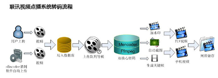 视频文件上传后首先进行转码,联讯视频点播系统采用队列等待式视频转码方式,采用Mencoder、Ffmpeg双核心转码方式,自动将各种格式的视频统一转为FLV格式的视频。视频转换后会存储在FLV服务器中,并在中心服务器生成web页面,由用户进行浏览。Flv存储服务器可以按需扩充。
